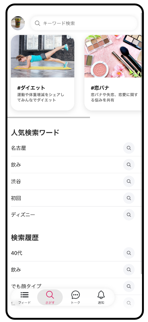共通の趣味や話題をピンポイントで検索。気になるユーザーやつぶやきがすぐ見つかります。